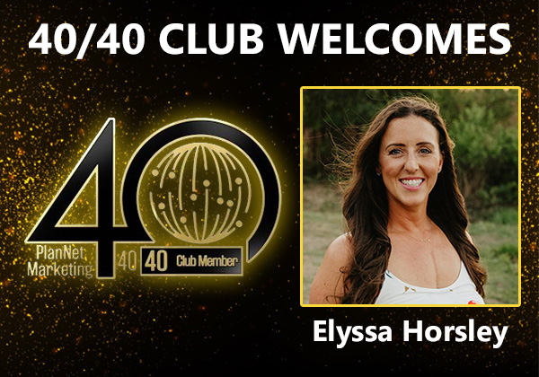 PlanNet Marketing is pleased to welcome Elyssa Horsley to the 40/40 Club! Elyssa tells us, "I am a wife and mother of an energetic toddler with another on the way due in early summer. My goal is Directorship before baby #2 arrives! What reaching 40/40 tells me and having a team of 60+ is that people WANT to do this. They just need us to connect them to it. They need us to be loud and proud about what we have to offer with this business and not be afraid to have those conversations, in person or on social media.
